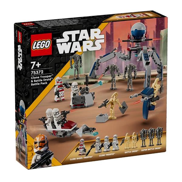 Inspire youngsters to recreate thrilling Star Wars: The Clone Wars scenes with this LEGO Star Wars Clone Trooper & Battle Droid Battle Pack (75372). An out-of-this-world Star Wars-themed gift for boys and girls aged 7 plus years old. This LEGO Star Wars building toy for kids features 4 LEGO Star Wars minifigures and 5 LEGO figures – a Clone Shock Trooper, 3 Clone Troopers, 3 Super Battle Droids and 2 LEGO Star Wars Battle Droid figures – with iconic weapons for action play.